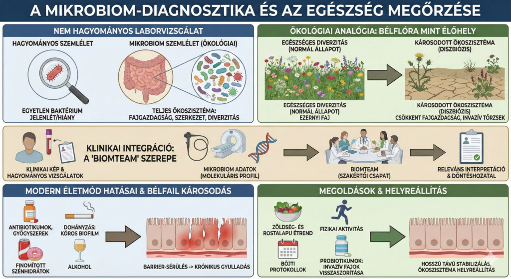 A mikrobiom-diagnosztika nem hasonlítható össze a klasszikus laborvizsgálatokkal: szemlélete sokkal közelebb áll a szövettani és morfológiai elemzésekhez. A vizsgálat ugyanis nem egyetlen baktériumtörzs jelenlétét vagy hiányát értékeli, hanem az egész bél-ökoszisztéma fajgazdagságának, szerkezetének és diverzitásának sérülését. Nem az a kérdés, hogy egy adott baktérium „kimutatható-e”, hanem az, hogy egy normál állapotban akár ezernyi fajból álló közösség miért csökken le töredékére. A mikrobiom minden emberben egyedi, mégis pontosan vizsgálható, hogy bekövetkezett-e ökológiai károsodás, és ennek milyen mértékű funkcionális következményei vannak.